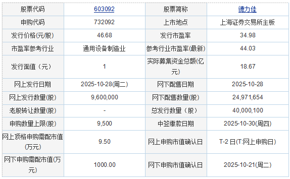 德力嘉传动科技(江苏)有限公司 保荐机构(首席管理人):华泰联合证券股份有限公司 刊登状态: 公司简介:主要从事高速、高负载精密齿轮传动产品的研发、生产和销售。目前下游应用领域主要为风力发电机组,主要产品为风力发电用主传动装置。南京晨瑞直接持有公司30.53%的股份,为公司第一大股东。南京陈锐直接持有该公司30.53%的股份。孔金峰直接拥有该公司7.63%的股份,并与刘建国共同拥有南京晨瑞投资100%的股权。同时,孔金峰担任无锡德通执行合伙人,拥有无锡德通21.40%的股权。f 无锡德通投资,间接控制该公司3.82%的股份。刘建国和孔金峰是一对夫妻。他们直接和间接合计持有公司38.98%的股份,共同控制公司41.98%的股份。他们才是公司真正的管理者。德利西亚2025年10月17日披露的首次公开发行股票及主板上市招股书显示,公司拟募集资金18.808亿元,用于汕头德利西亚传动股份有限公司年产1000台8MW以上陆上风电大型齿轮箱和年产800台海上风电大型齿轮箱。 D公司于2025年10月27日公告首次公开发行Eelizia并主板挂牌表明,按发行价格46.68元/股、新股发行数量40,000,100股计算,若本次发行成功,公司预计共募集资金186,720.4668元。名词1万元扣除发行费用9294.72万元(含印花税,不含增值税)后预计融资净额为177,425.74万元(末位如有差异,四舍五入)。中诚智新工程咨询集团股份有限公司(北京证券交易所) 保荐机构(总管理人):苏州证券股份有限公司 刊发状态: 公司简介:公司凭借优秀的技术团队和丰富的项目经验,致力于为客户提供工程项目、招标代理、项目监督管理、BIM服务、工程设计等专业技术服务和全流程咨询。服务。公司成立于2002年1月,2016年12月在全国证券交易所、股票市场公开转让挂牌,2023年5月升级为创新级。公司控股股东为徐学雷,实际控制人为鲁军和徐学雷。截至招股说明书签署日,徐学雷直接持有公司股份29,109,222股,直接持股比例为57.40%,作为程来恒、程兴恒的执行合伙人控制公司股份15,000,000股,间接持股比例为29.58%。徐学雷合计持有公司股份44,109,222股。这些股份合计控制公司86.98%的投票权。陆军先生虽未持有本公司股份,但担任本公司总裁、董事总经理,在公司管理决策中发挥重要作用。因此,陆军、徐学雷为公司实际管理人员。根据中诚咨询2025年10月14日公布的招股说明书(征求意见稿)显示,公司拟募集资金19,989.52万元,用于工程咨询服务网络建设项目、研发、信息化建设项目。据华晨咨询2025年10月24日关于向不特定合格投资者公开发行股票并在北京证券交易所上市的公告显示,若发行成功,公司预计募集资金总额19978万元。扣除发行费用2661.6万元(不含增值税)后预计融资净额为173,164千元。